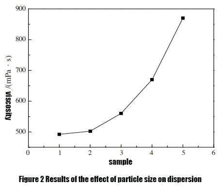 The difference in viscosity between sample 1 and sample 2 is small. From sample 3 onwards, the viscosity of the product increases rapidly. This shows that when the particle size is small, the difference in dispersion of the product is small. As the particle size of the product increases, the dispersion of the product decreases. The differences gradually emerged and increased exponentially.