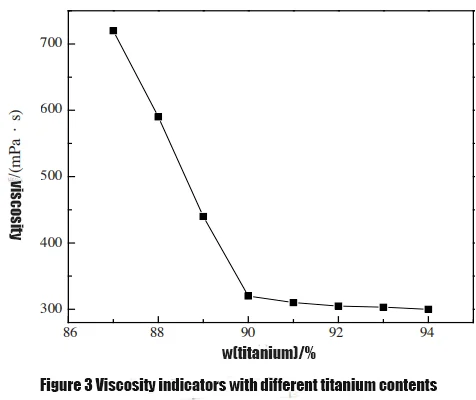As can be seen from Figure 3, as the titanium content increases, the viscosity of the product shows a downward trend, that is, the higher the titanium dioxide content in titanium dioxide, the better the dispersibility of the product.