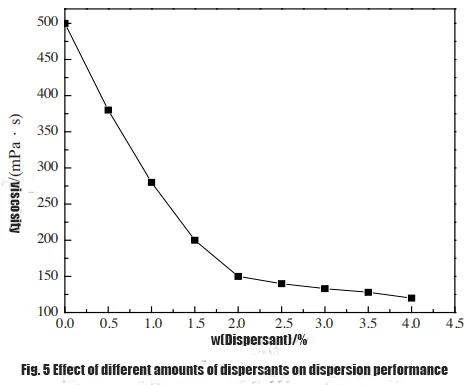 As can be seen from Figure 5, the addition of dispersant can effectively reduce the viscosity of titanium dioxide and improve the dispersion performance. Especially when the dispersant dosage is within 0.2%, the viscosity can be quickly reduced. When the dispersant dosage continues to increase, the viscosity decreases. The amplitude decreases and the effect is less obvious.
