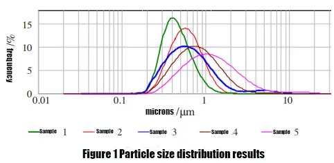 It can be seen from Figure 1 that the particle size distribution of Sample 1 to Sample 5 gradually becomes wider, and the peak particle size also gradually becomes larger. Therefore, the average particle size of Sample 1 to Sample 5 gradually becomes larger.
